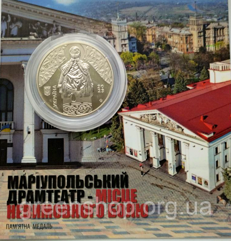 Пам`ятна медаль монета Маріупольський драмтеатр - місце невимовного болю у сувенірній упаковці
